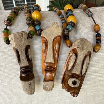 Using a mash-up of styles, artist Chad McCollum carves funky sculptures and wall hangings for home and bar decor, as well as pendants of all shapes and sizes to complete your look.